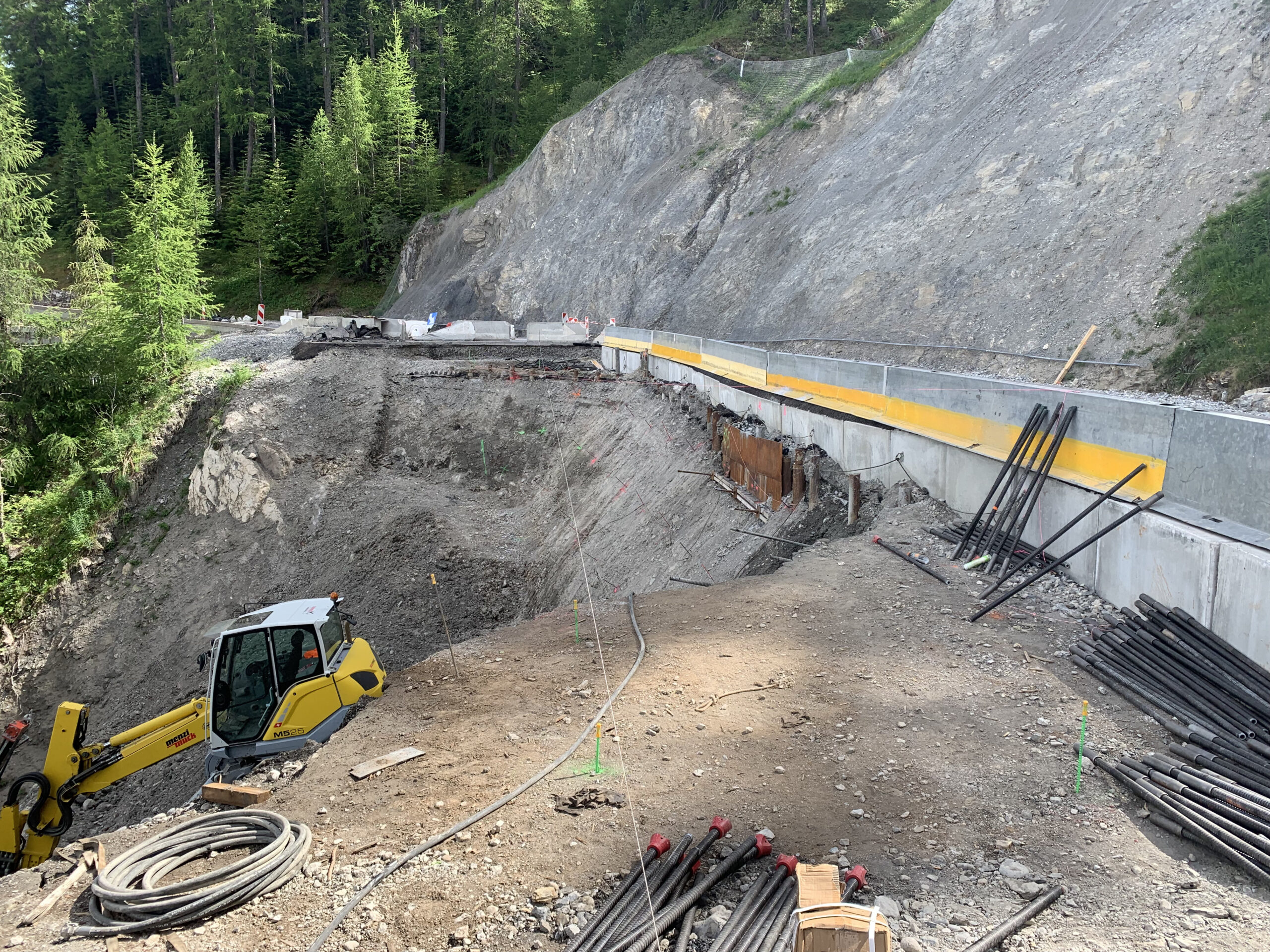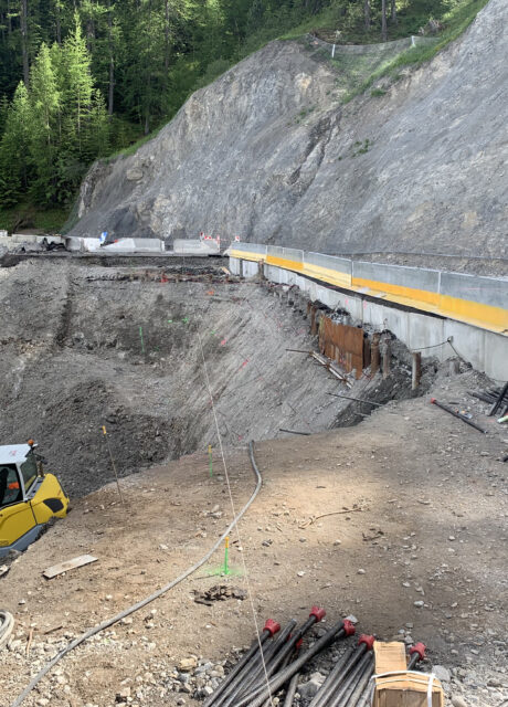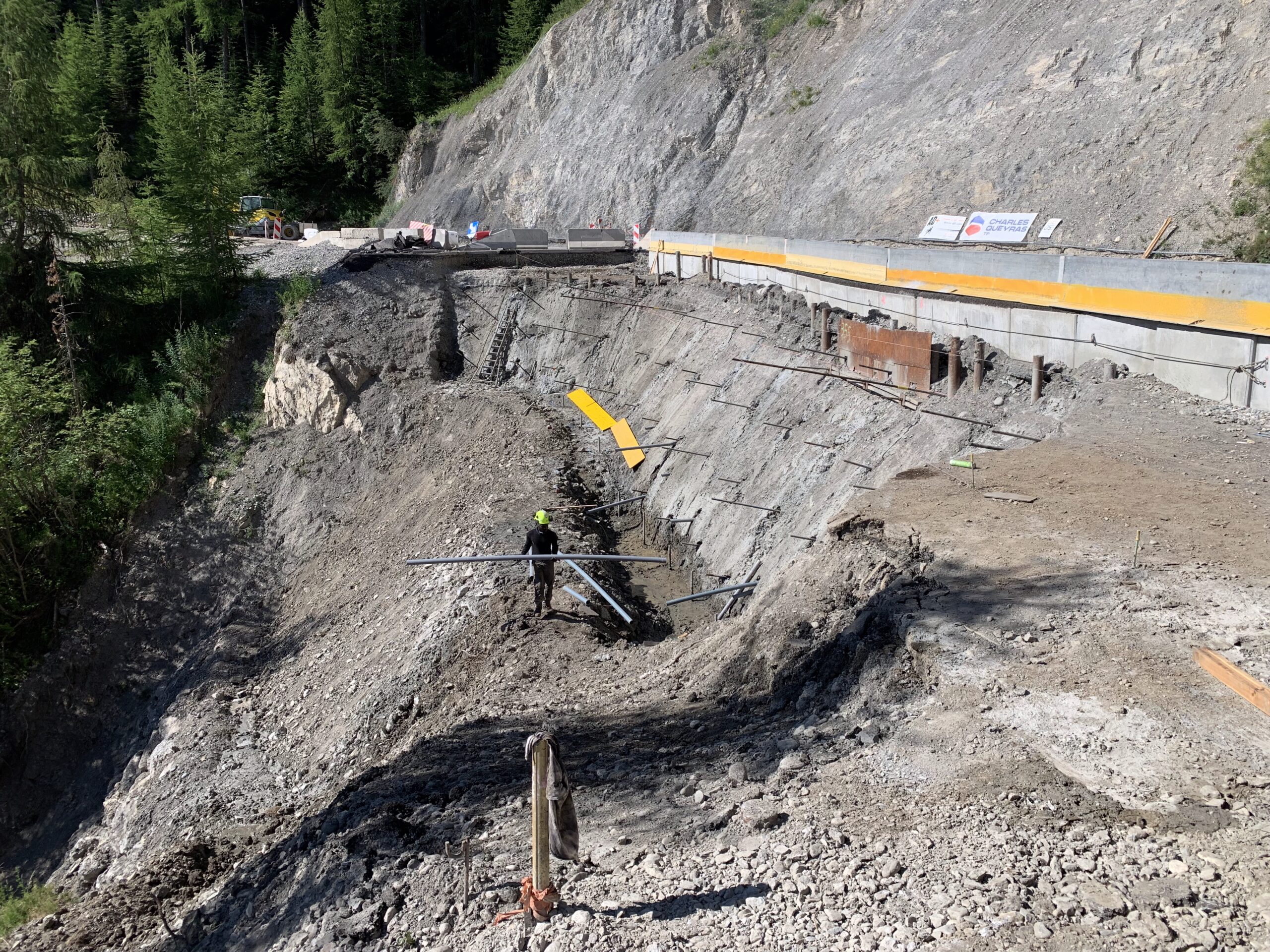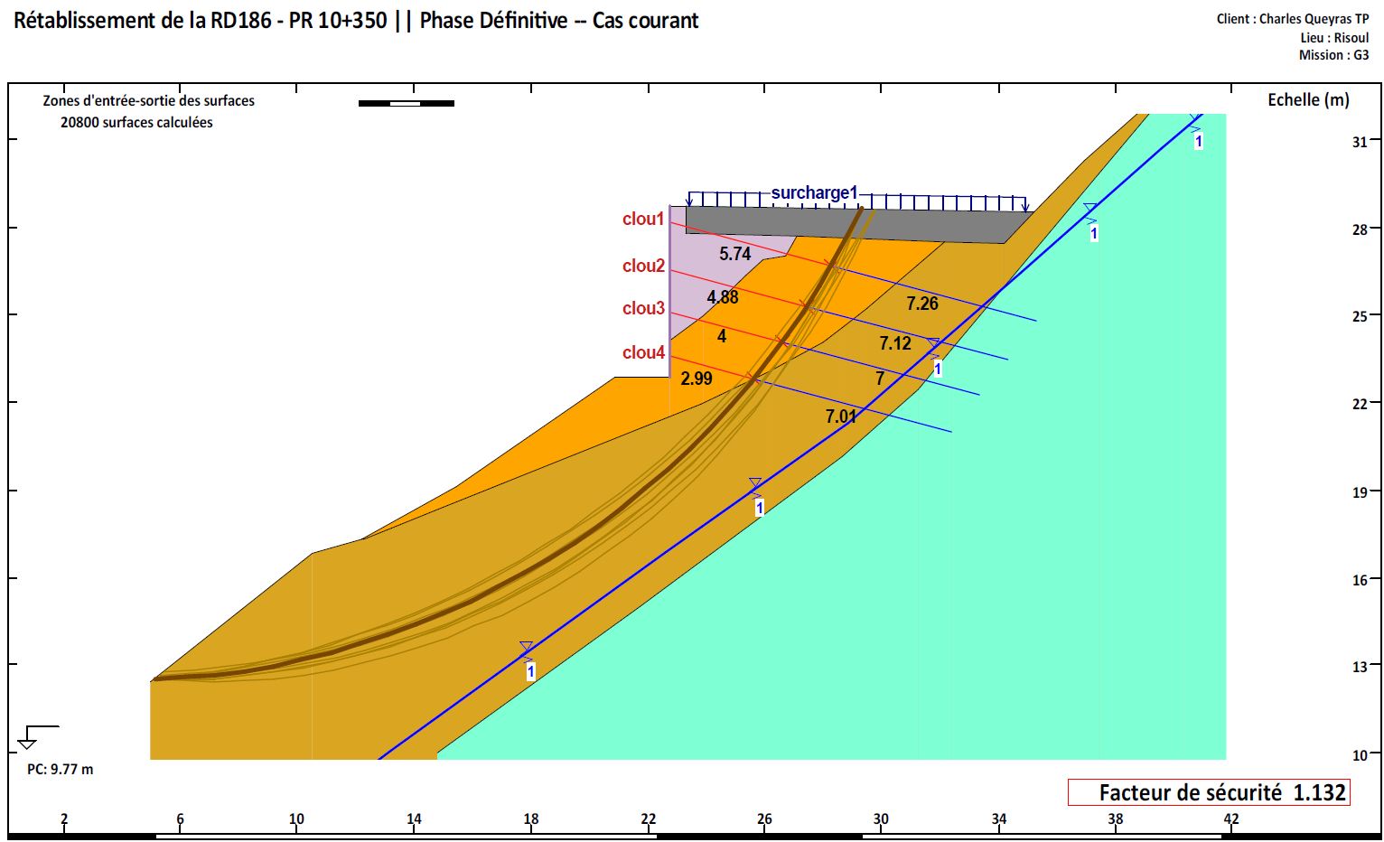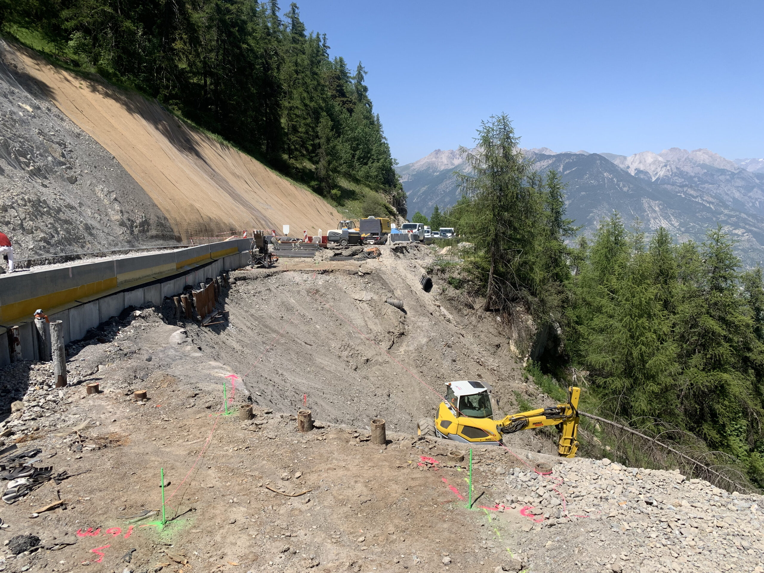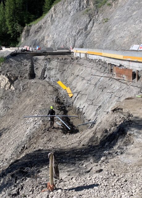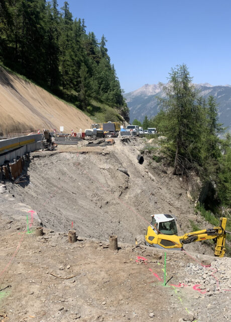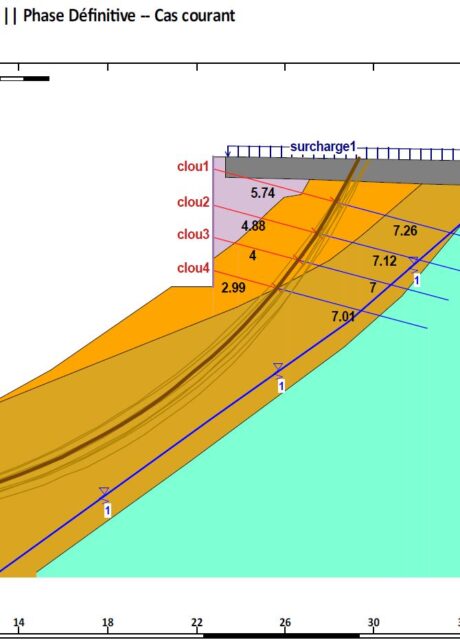 Il a été réalisé un confortement passif par pose d’un grillage déflecteur sur le talus rocheux amont et une paroi clouée sur coffrage perdu au droit de la zone sinistrée. Nous avons assuré le suivi du chantier après avoir rédiger une étude dont le but était de vérifier le dimensionnement et énoncer les préconisations spécifiques à ce type d’ouvrage